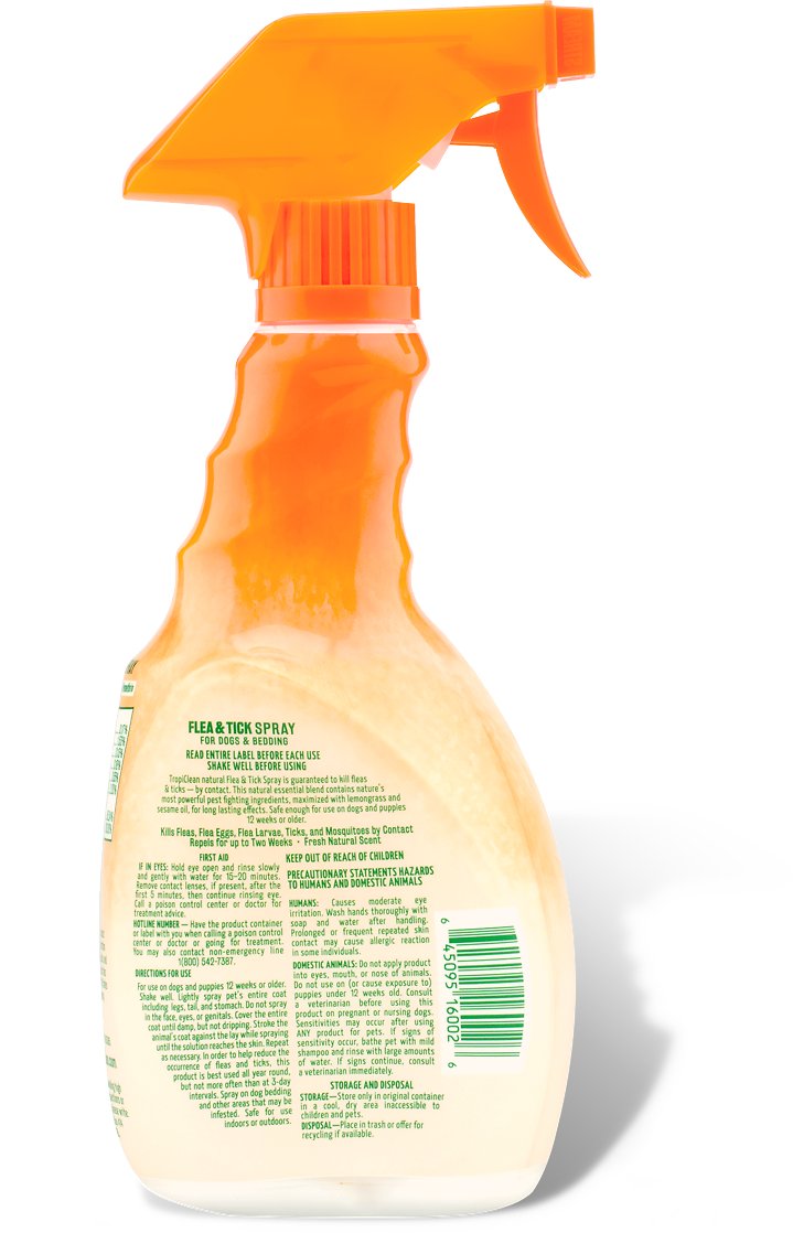 - Sản phẩm bình xịt của Tropiclean có công thức đặc biệt được lấy từ 4 loại tinh dầu tự nhiên bao gồm: dầu đinh hương, dầu sả, dầu gỗ tuyết tùng và dầu quế. 4 loại tinh dầu này có mùi đặc trưng khiến ve bọ chét sợ và không bám trên lông da của chó.